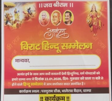 Other Articlesचाम्पा में 22 जनवरी को विराट हिन्दू सम्मेलन, साथ होगा रुद्राक्ष जागरण एवं प्रतिष्ठा महोत्सव…Ps TripathiJanuary 15, 2026January 15, 2026